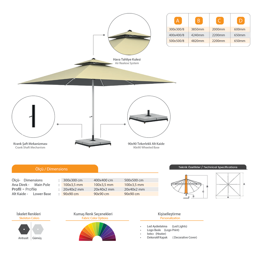 İthal akrilik kumaş ve hava tahliye bacası sayesinde rüzgâra karşı üstün direnç sağlar.